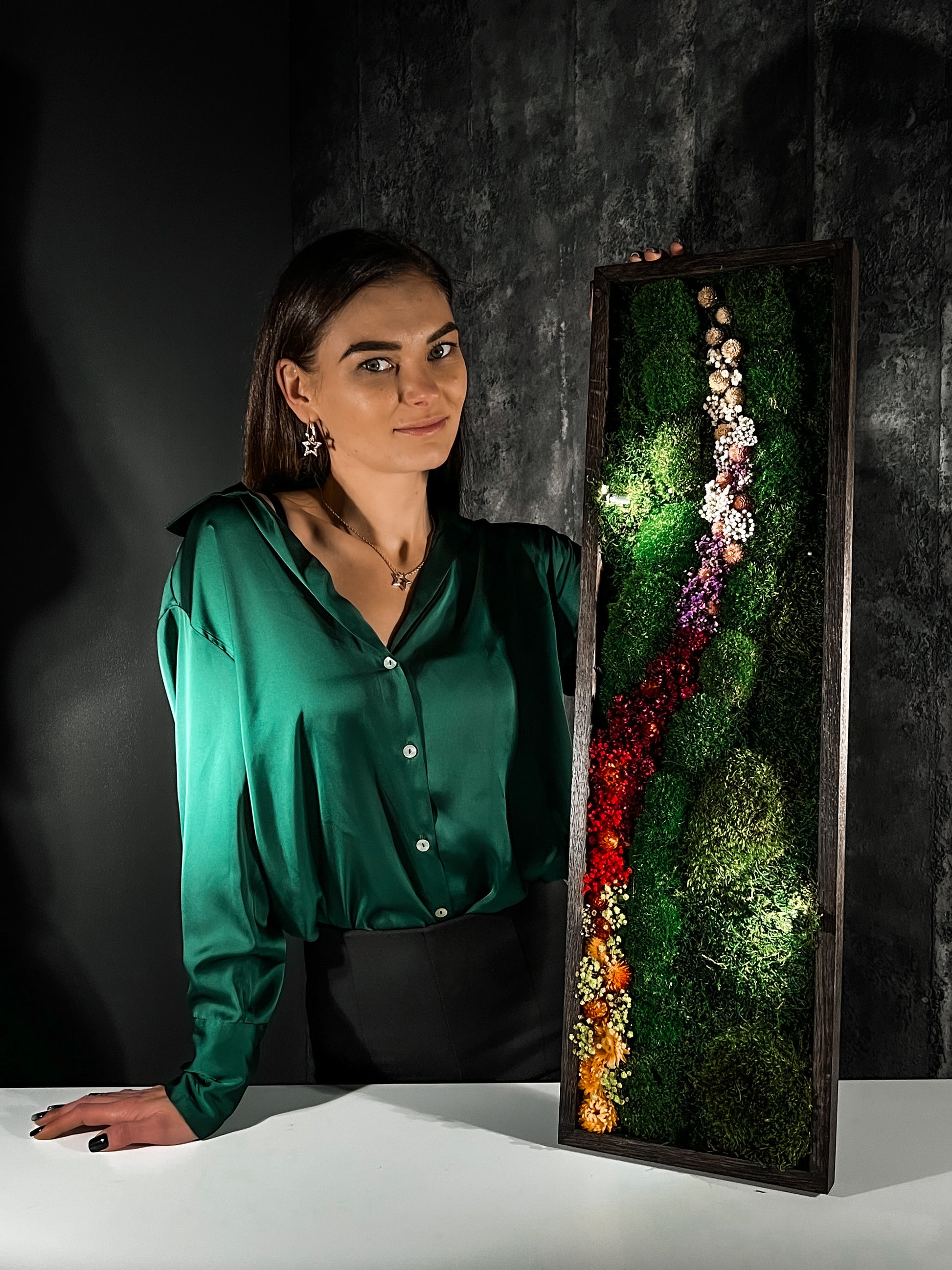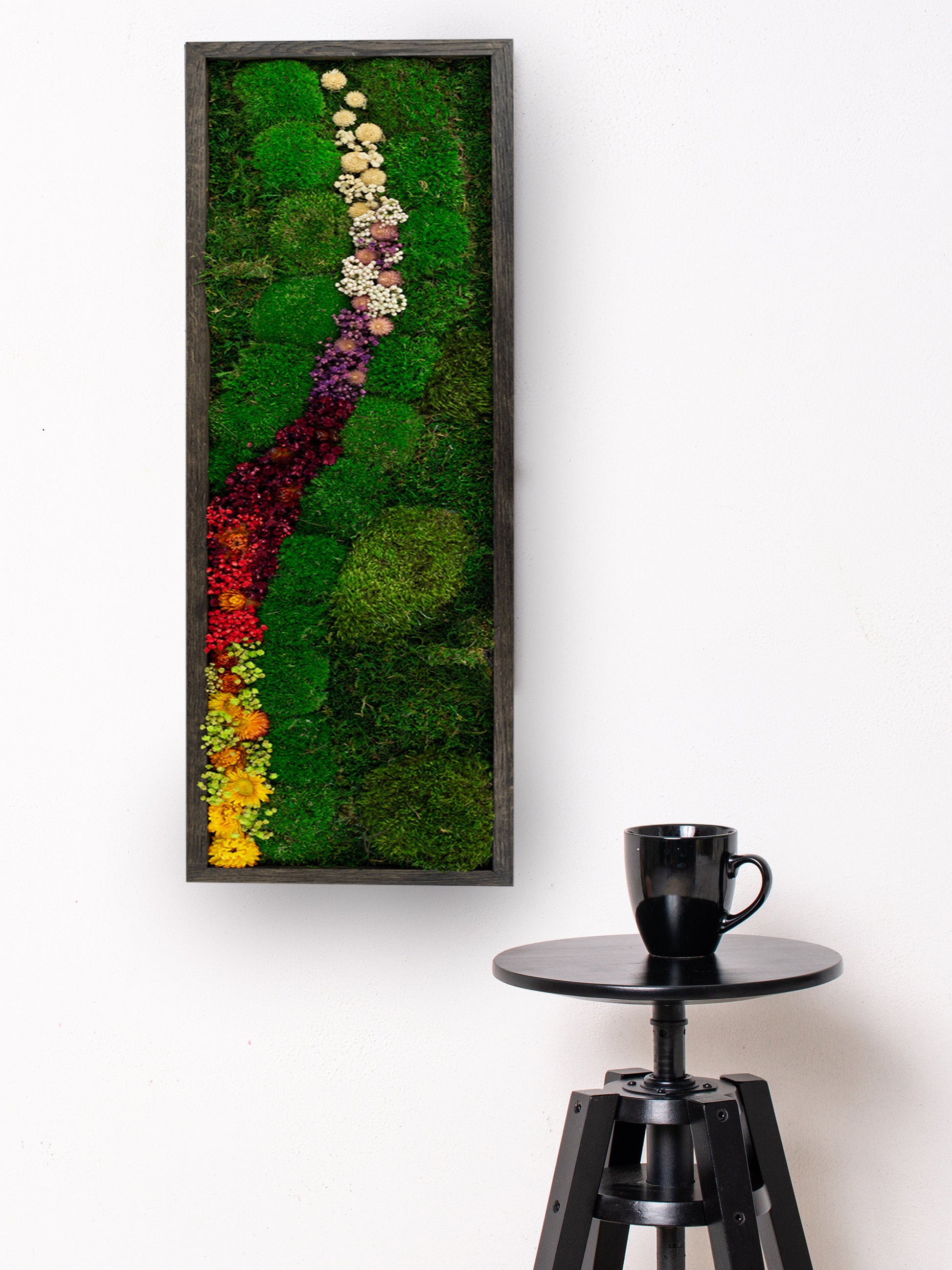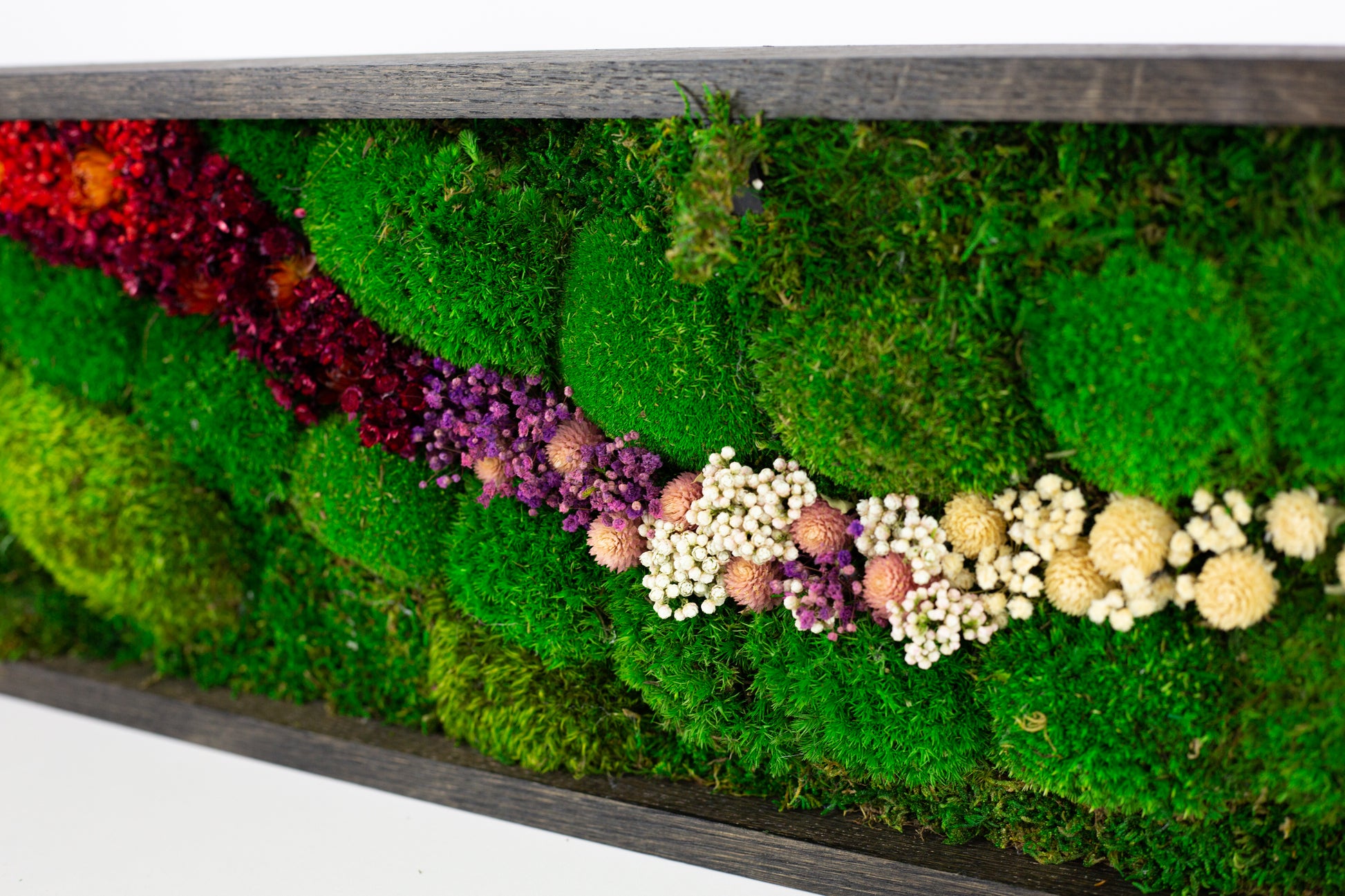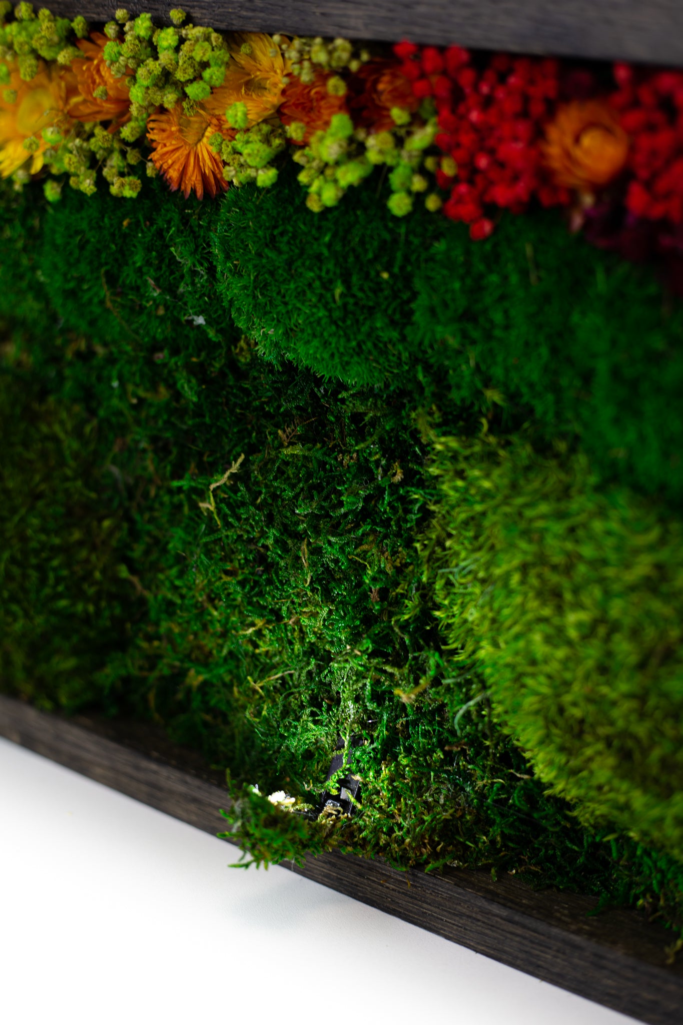 Unser atemberaubendes, handgefertigtes Pflanzenkunstwerk ist ein besonderes Deko-Objekt für Ihr Zuhause. Für die Herstellung verwenden wir Eichenholz, Moos und Pflanzen und kombinieren diese Elemente zu einem fantastischen, modernen Design, das Ihrem Zuhause eine völlig neue Dimension verleiht! Verbinden Sie Pflanzen und Malerei zu einem einzigartigen Kunstwerk, das Ihrem Zuhause Lebendigkeit und Inspiration schenkt! Lassen Sie sich von diesem wunderschönen, pflanzeninspirierten Wandbild inspirieren! Mit einem Rahmen Ihrer Wahl wird es alle Blicke auf sich ziehen! Die Möglichkeit, es in verschiedenen Größen oder Farben anfertigen zu lassen, macht unser Angebot einzigartig und perfekt! Bereichern Sie Ihr Zuhause!