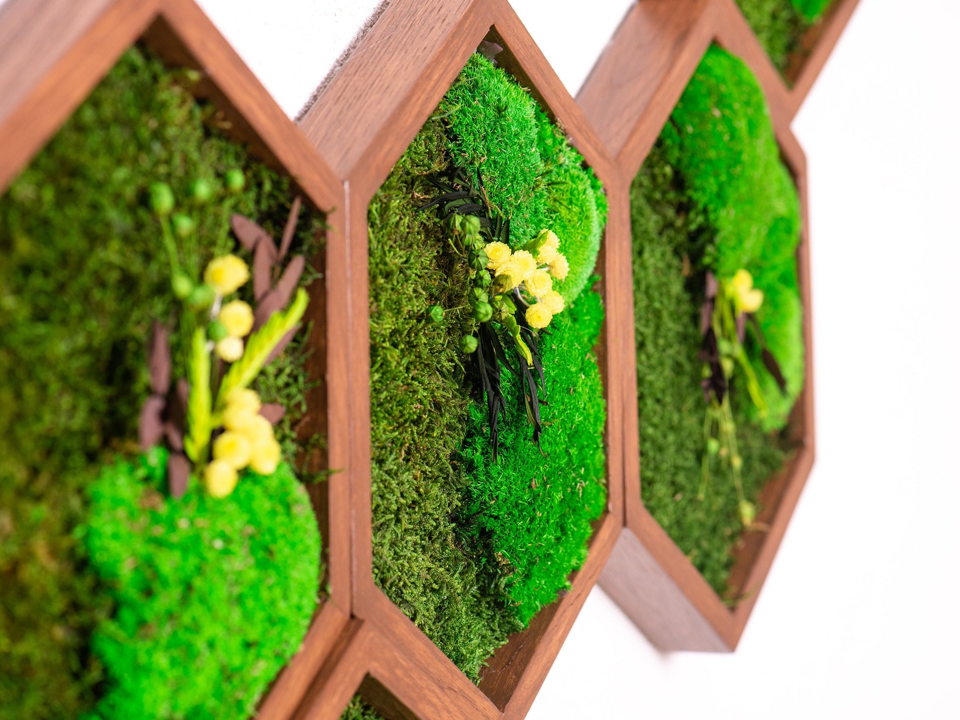 Minimalistische Mooskunst: Wabenförmige Wanddekoration fürs Homeoffice – Luftreinigendes Weihnachtsgeschenk!