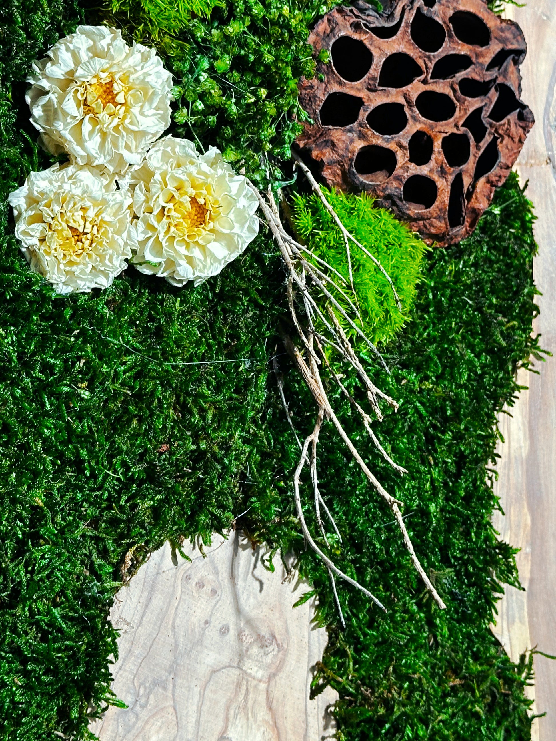 The moss is framed in natural olive wood, adding a rustic touch to the modern design. The oak frame is not just a border, but a part of the artwork itself. The natural grain and texture of the oak wood complement the moss, creating a harmonious blend of materials. The frame is also available in a burned oak finish, offering a darker, more dramatic look.