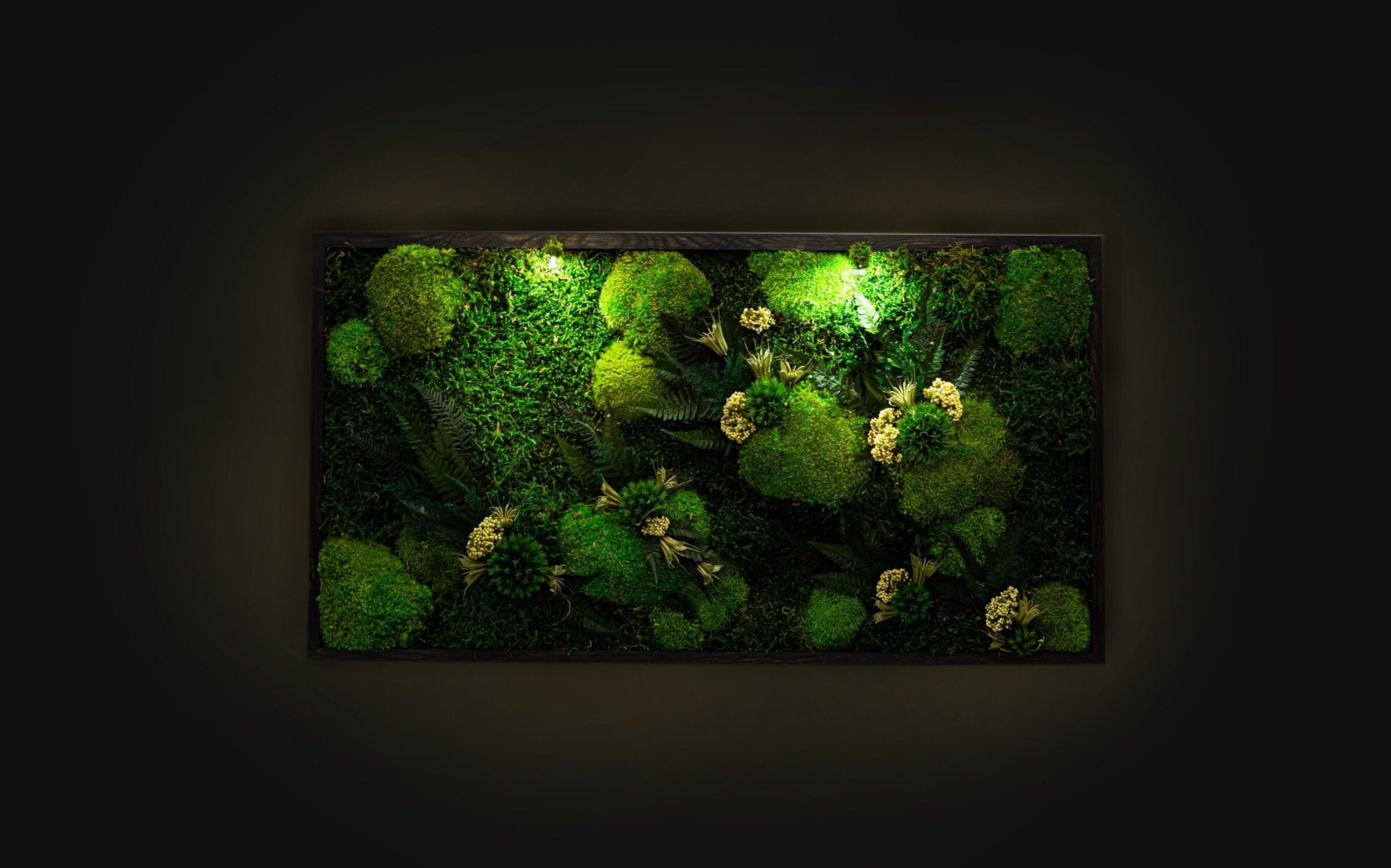 Das Besondere an diesem Kunstwerk sind die integrierten LED-Leuchten , die das Moos beleuchten und so ein faszinierendes Leuchten erzeugen, das dem Werk Wärme und Tiefe verleiht. Die Leuchten sind sorgfältig positioniert, um die feinen Details des Mooses hervorzuheben, seine natürliche Schönheit zu unterstreichen und eine beruhigende Atmosphäre in Ihrem Raum zu schaffen.