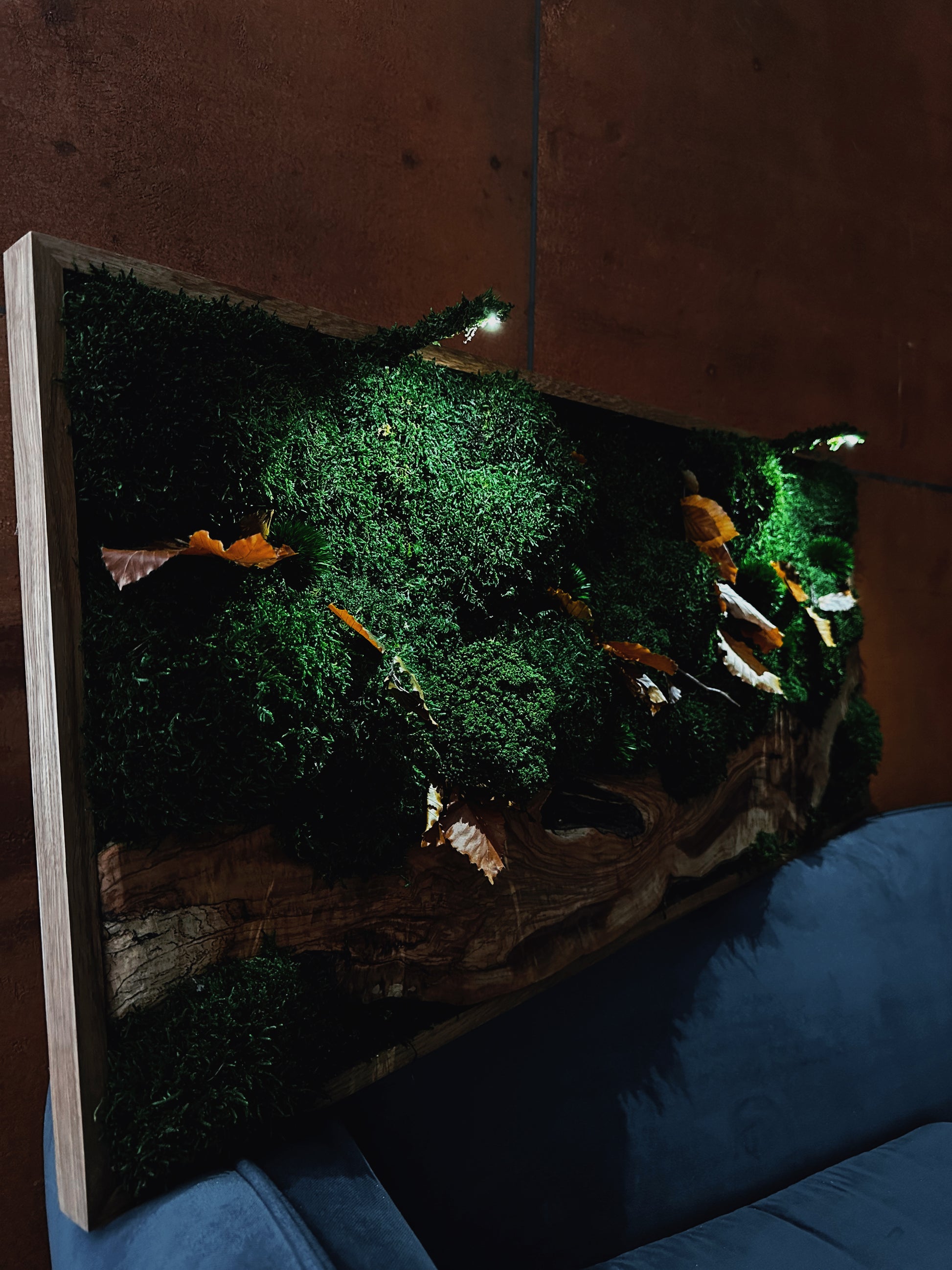 Handgefertigte Pflanzenkunst aus Holz | Mooskunst | Wandkunst aus Eiche und Pflanzen | Einzigartiges Deko-Element | Originelle LED-Wandkunst