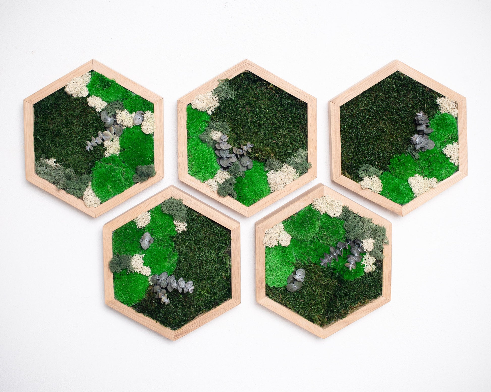 Jedes einzelne Stück dieses Sets ist sorgfältig aus natürlicher Eiche gefertigt und mit lebendem Moos verziert. Das Moos wird schonend konserviert, um seine leuchtend grüne Farbe und natürliche Textur zu bewahren und dem Wandbild eine frische und lebendige Ausstrahlung zu verleihen. Das Wabenmuster setzt einen geometrischen Akzent zu den organischen Elementen und schafft so ein harmonisches Gleichgewicht zwischen Natur und moderner Ästhetik.